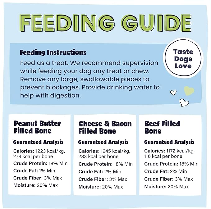 - This Variety Pack includes 1 Peanut Butter, 1 Cheese & Bacon, and 1 Beef Filled Bone. Our filled bones for dogs are Made in the USA to ensure the healthiest and safest possible dog chews. Our Midwest processing plant adheres to the strictest of quality assurance standards and sources free range, grass fed cattle. Additionally, our facilities are audited, inspected, and approved by the relevant governing bodies and outside 3rd party inspectors.