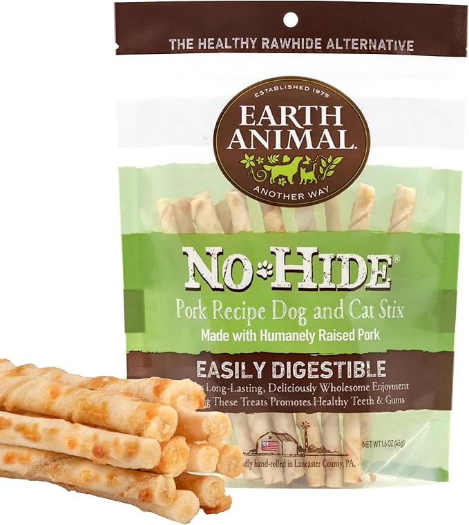 Earth Animal No Hide Stix Pork Flavored Natural Rawhide Free Dog Chews Long Lasting Chew Sticks | Treats for Small Dogs and Cats | Great for Aggressive Chewers (1 Pack)