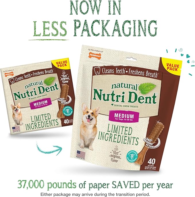 Nylabone Nutri Dent Dog Dental Chews, Natural Teeth Cleaning Dental Treats & Breath Freshener for Dogs, Filet Mignon Flavor, Medium (40 Count)