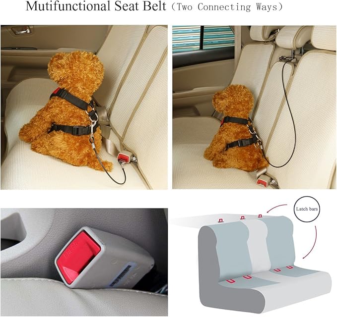 - MULTI-CONNECTING WAY: Double seat belt attachment design,you can connect it to your car's regular seat belt with the nap OR you can connect it to latch bar in your cars back seat creases.so the passager and your pet can use the seat belt in the same time without influence.