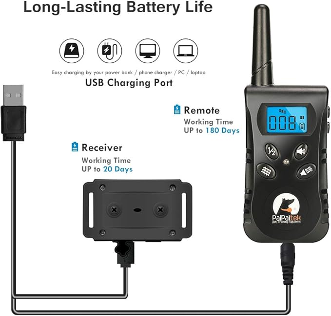 - UP TO 20 DAYS OF RECHARGEABLE BATTERY LIFE - 2 hours of full charge, the remote no-shock dog collar can work for 20 days, of course it depends on the frequency of your use.