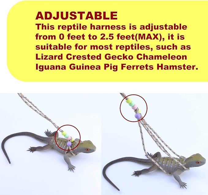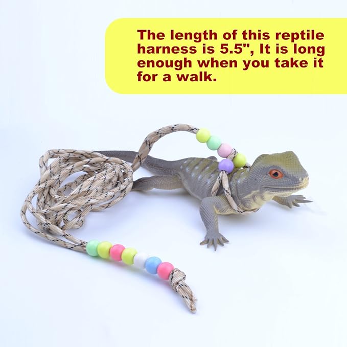 - BEADS DESIGN: The reptile training lead leash is design by many colorful beads, the beads could tighten the harness, you could also place the beads on the top of rope so that you could hold the harness easily