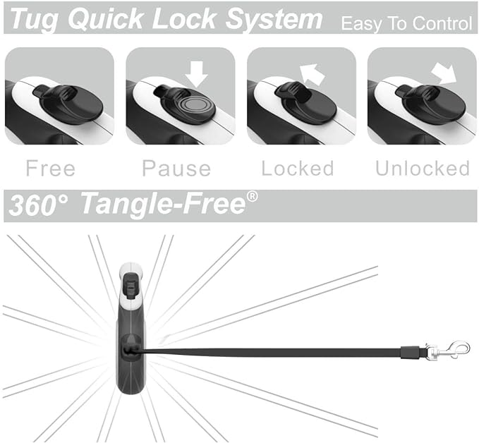 TUG 360° Tangle-Free Retractable Dog Leash with Anti-Slip Handle | 16 ft Strong Nylon Tape | One-Handed Brake, Pause, Lock (Small, White)