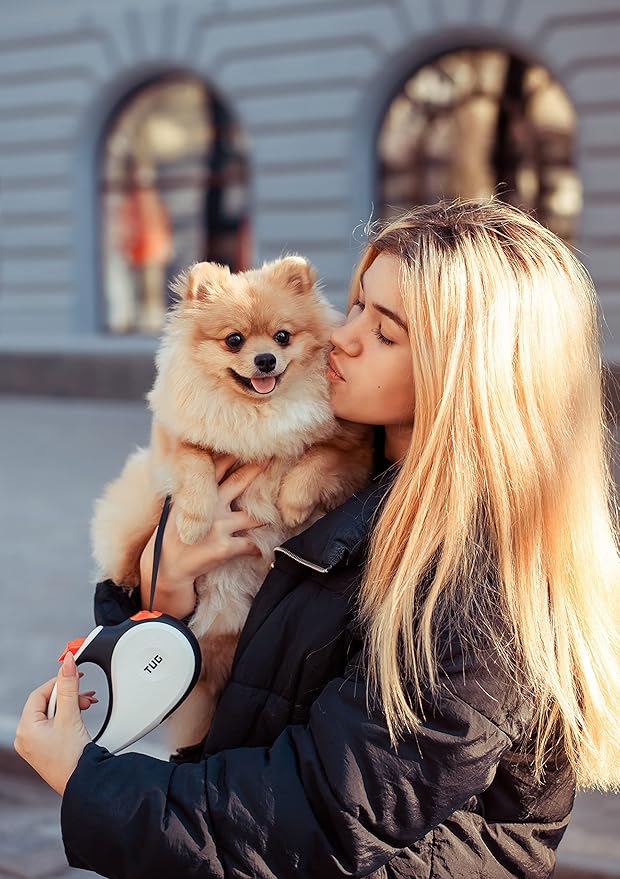 TUG 360° Tangle-Free Retractable Dog Leash with Anti-Slip Handle | 16 ft Strong Nylon Tape | One-Handed Brake, Pause, Lock (Small, White/Orange)