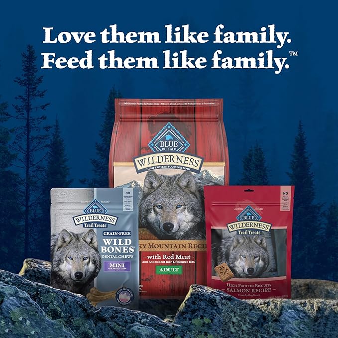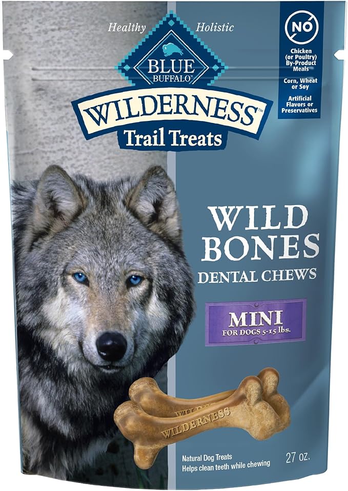 - Contains: One (1) 27-oz bag of BLUE Wilderness Trail Treats Wild Bones Mini Dental Chew Dog Treats