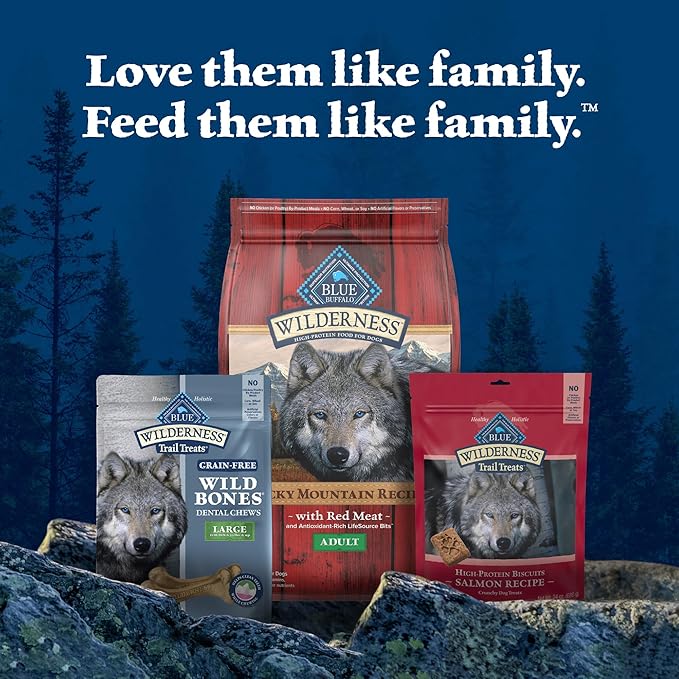 - Contains: One (1) 27-oz bag of BLUE Wilderness Trail Treats Wild Bones Large Dental Chew Dog Treats