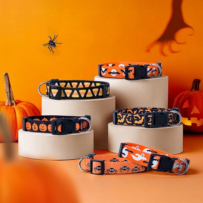 Native Pup Halloween Dog Collar- Spooky Fall Themed Horror Costume Collars- Skull, Pumpkin, Ghost, Bat, Witch, Candy Corn, Spider- Adjustable for Small, Medium, Large Breeds (Medium, Orange Bats)