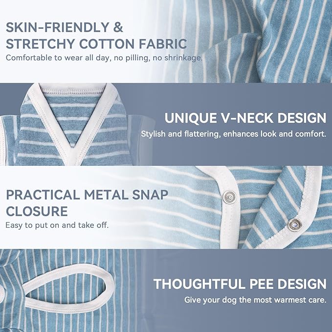 - 【Unique Design】There are four metal snap fasteners on the back of the clothes, beautiful and fashionable, easy to put on and take off. Four-legged design with elastic waist and unique stripes design, not easy to loose. The clothes' abdomen has a hole that convenient for the dog to urinate.