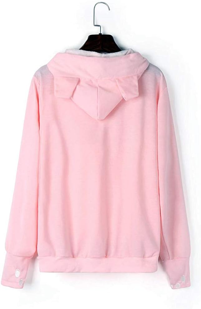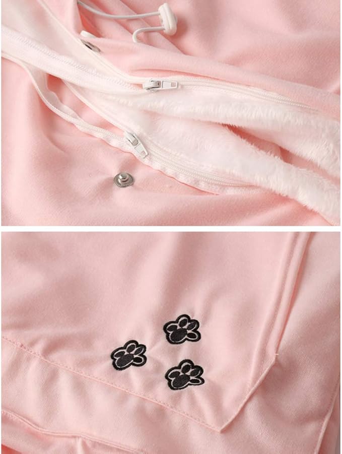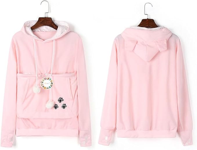 - SPECIAL DESIGN - Cute cat ears on hood, big kangaroo pouch, your small pets will love snuggling up in its fur-lined pouch.You'll look cute yourself with the pet carriers hoodie's ears and paw print design,A perfect gift for pet lovers. Women's Long Sleeve Kangaroo Sweatshirt Pullover Hoodie.