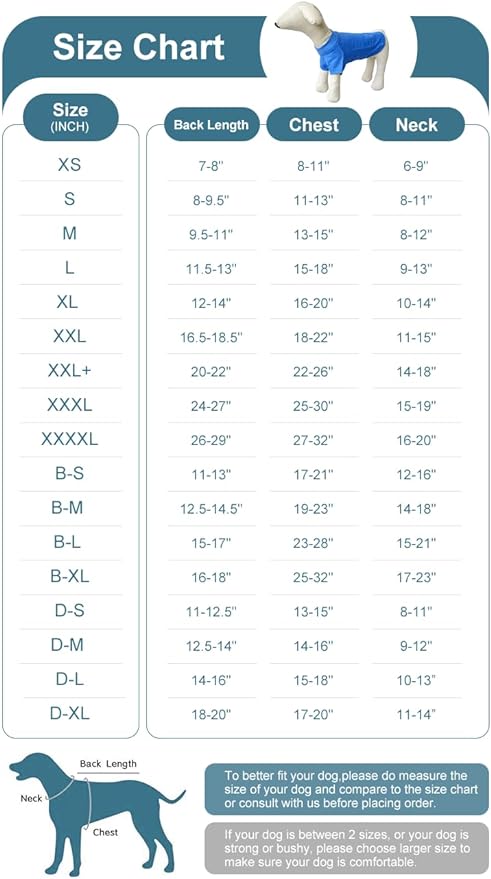 - 17 SIZES CAN BE CHOSEN - XS S M L XL Suitable for dog breed such as Chihuahua, Maltese, Miniature Pinscher, Poodle, Schnauzer, Shih Tzu, Etc small size dogs, XXL XXL+ XXXL XXXXL Sizes Suitable for Medium Large Size dogs such as Golden Retriever siberian husky Samoyed Rough Collie Labrador Shepherd Boston Terrier, B-S B-M B-L B-XL Suitable for Pugs,French Bulldog, English Bulldog, American Pit Bull/American Bully, D-S D-M D-L D-XL Suitable for Dachshund, Corgi Long Body Short Legs Dogs