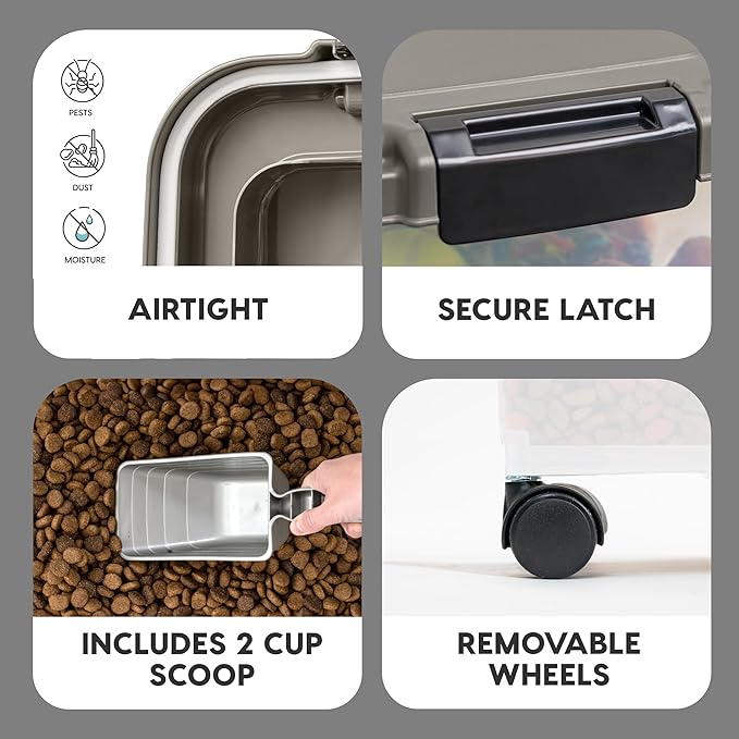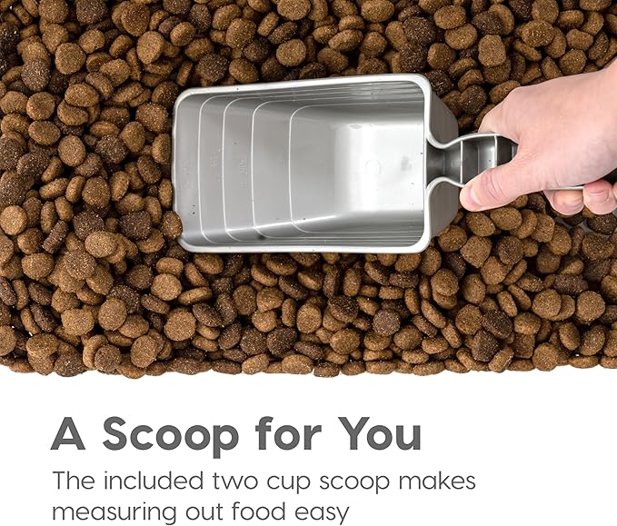 - CONTENTS: 11 lbs / 12 Qt storage container securely stacks on the 30 lbs / 33 Qt storage container, one matching 2-cup food scoop, and one set of wheels. Included scoop makes measuring food easy and attachable casters make it easy to roll it around.