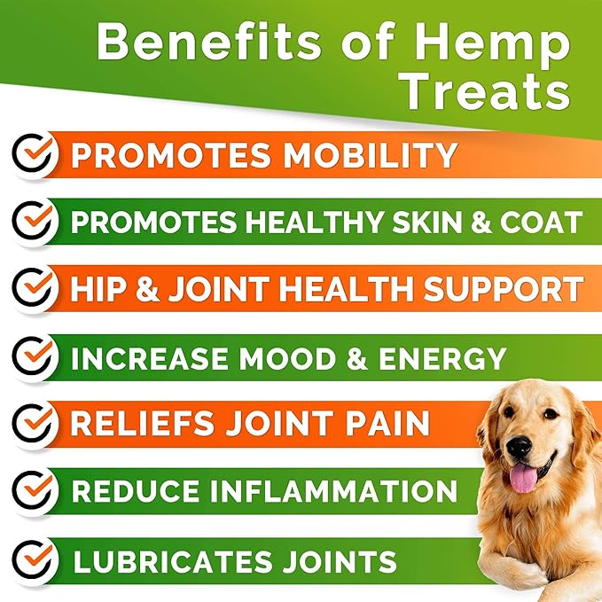 - SUPPORT YOUR DOG’S HIP AND JOINT HEALTH - Our hip & joint chews contain organic HEMP SEED OIL. It contain nutrients, fatty acids, and protein - that boost skin and coat health.