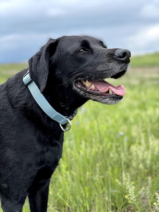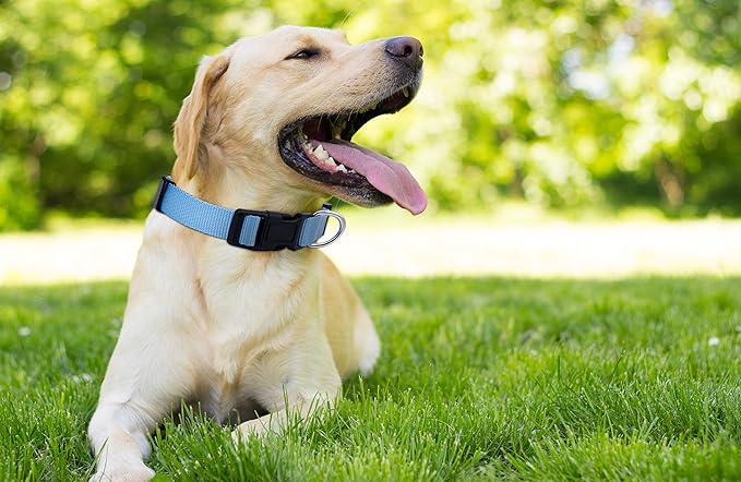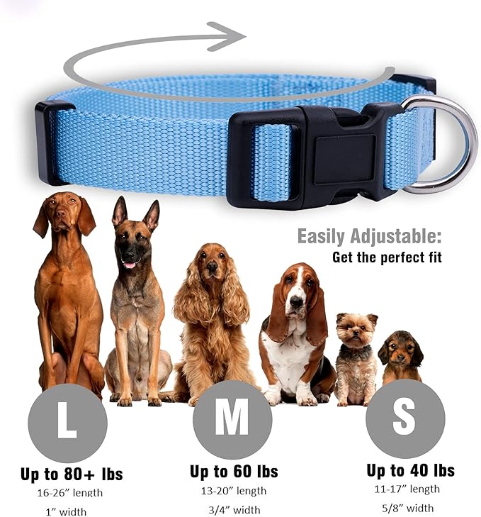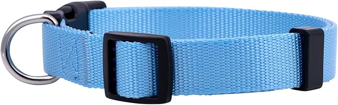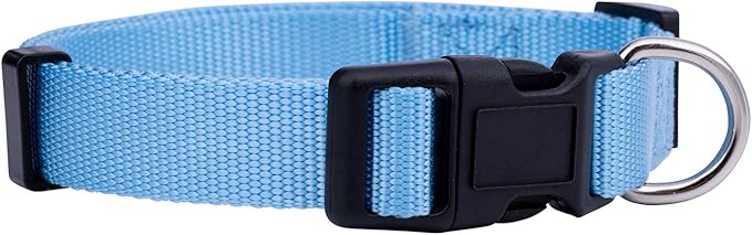 - Light Blue Dog Collar: These durable nylon dog collars are made of tough nylon that’s impossible to tear. Strong quick release clips reliably secure the colar around any dog’s neck. Metal D-Rings provide a secure attachment point for your leash.