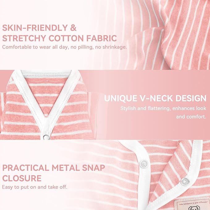 - 【Unique Design】There are four metal snap fasteners on the back of the clothes, beautiful and fashionable, easy to put on and take off. Four-legged design with elastic waist and unique stripes design, not easy to loose. These pajamas are designed for baby girls, protect belly design, keep baby warming