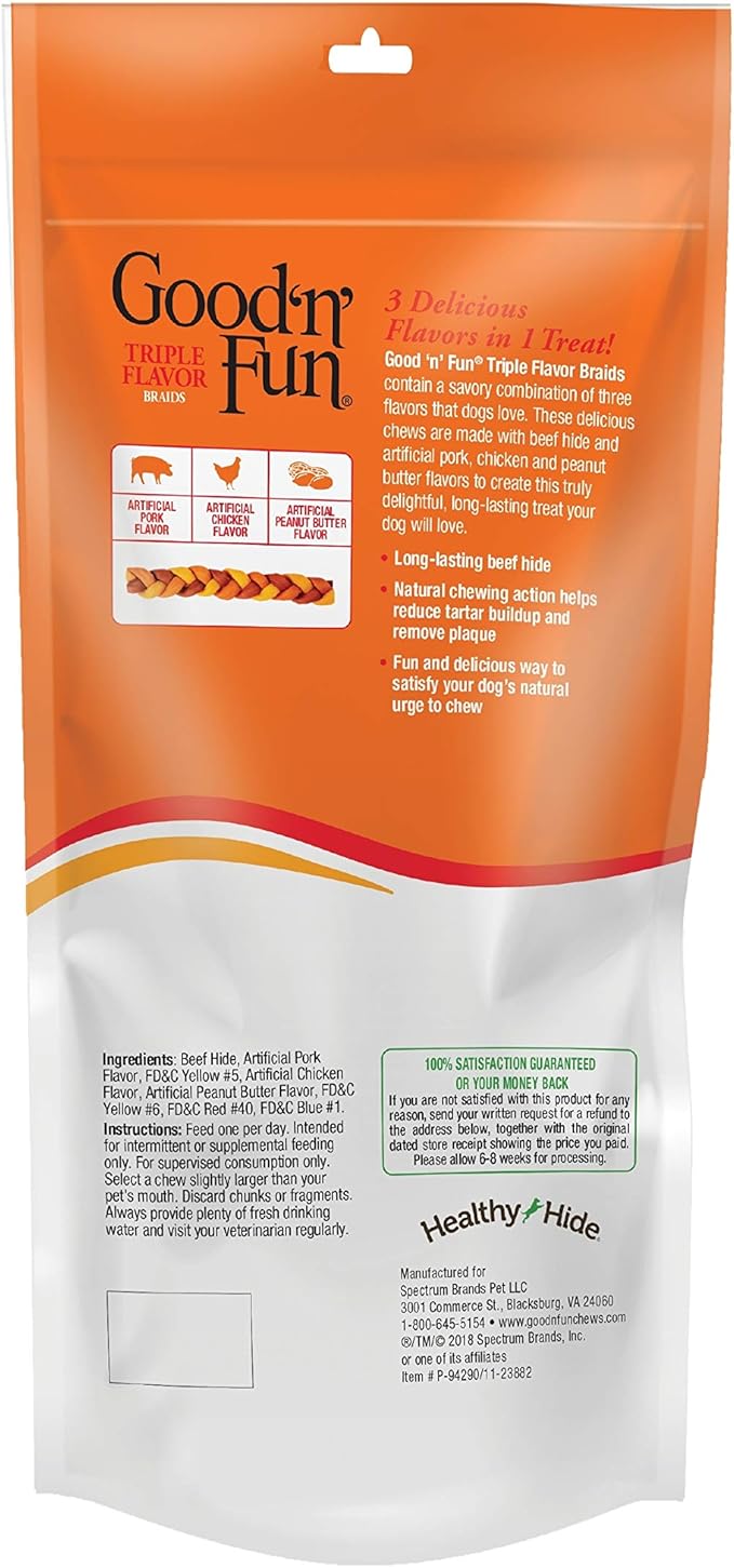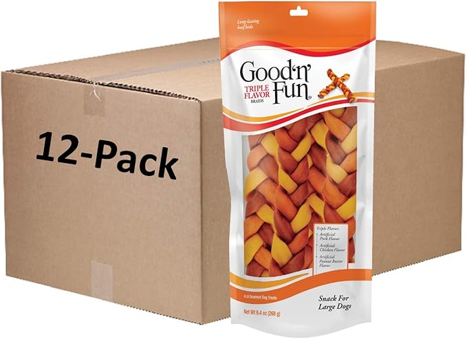 - Includes Qty twelve (12) of good 'n' Fun Triple flavor 9" Rawhide braid 4 ct