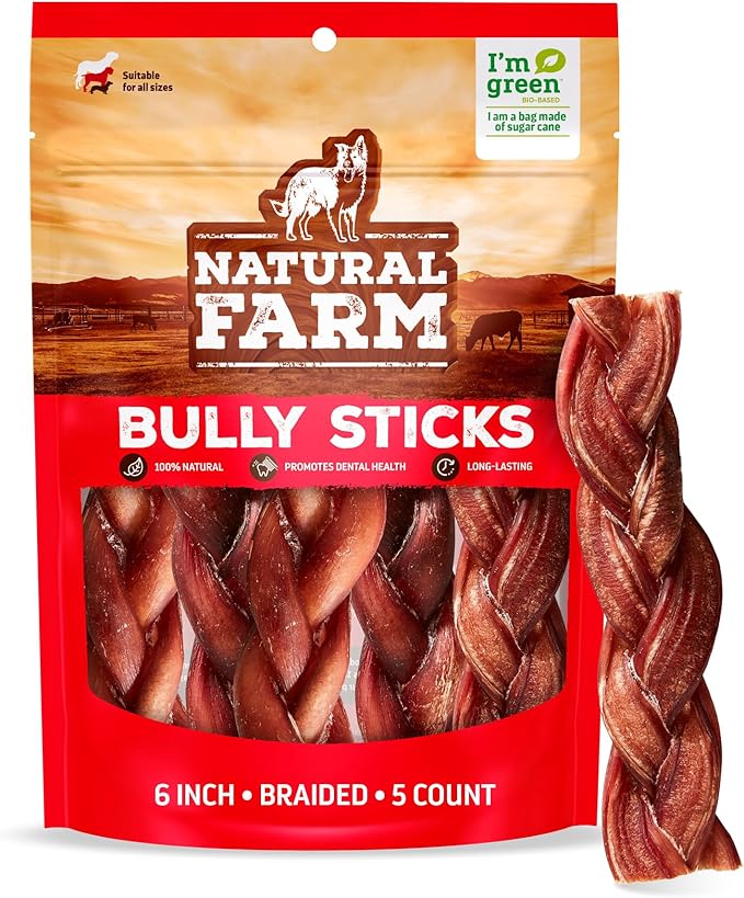 Natural Farm Odor-Free Braided Bully Sticks (6 Inch, 5 Pack) - 100% Grass-Fed Beef, Grain-Free, Low Fat & Fully Digestible Best Dental Treats - Safest Long Lasting Pizzle Chews to Keep Your Dog Busy