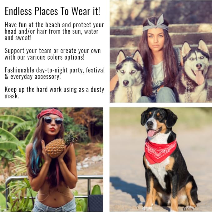 - Package includes 5 full size bandanas of your color choice, at 20 in by 20 in.