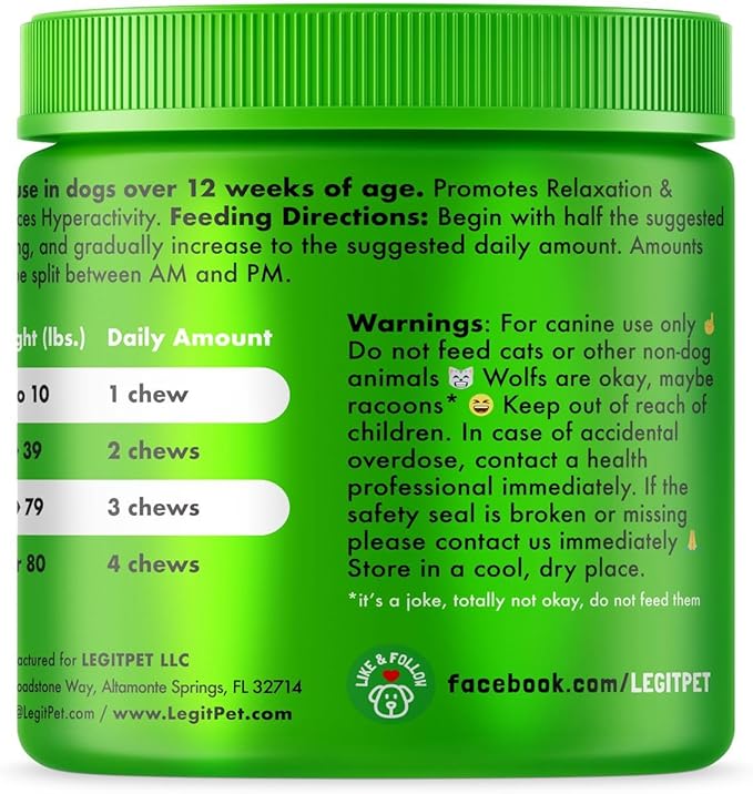 - LEGITPET calming bites for dogs work for small, medium and large breeds. Delicious natural duck flavoring in a soft chew form. Zero added fillers such as corn, dairy, soy or artificial ingredients