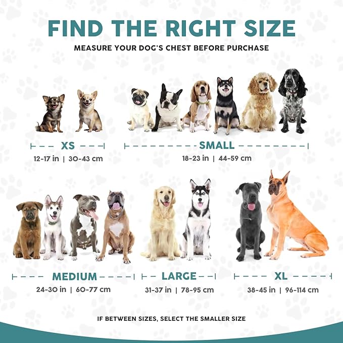 - HOW TO CHOOSE THE BEST SIZE - Longer straps with extra adjustment and reinforced safety clips helps you find the perfect fit. Please refer to the sizing chart in the main image. Our Large dog harness for large size dogs has chest measurements 38 - 45 inches & Neck 21 - 34.
