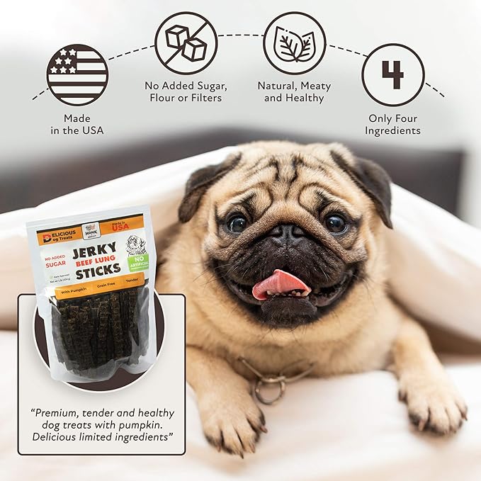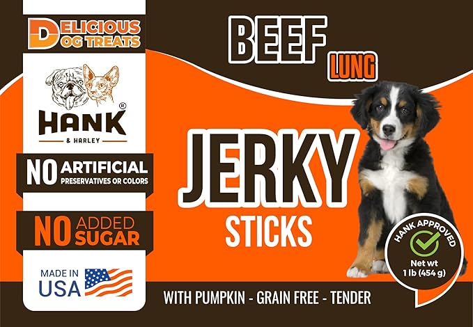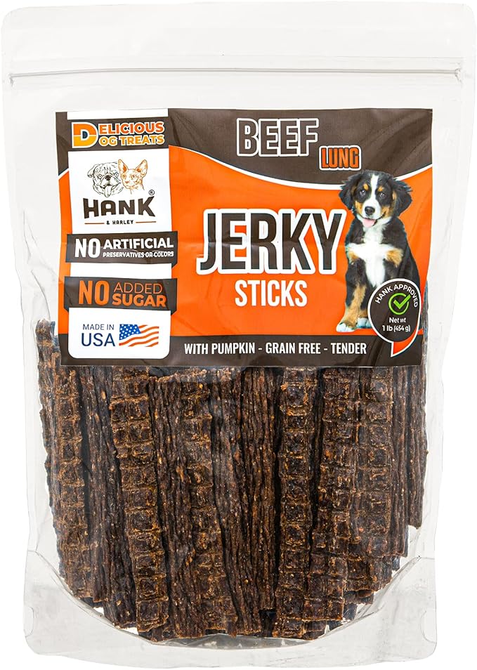 Hank & Harley Jerky Sticks Beef Lung 1 lb - USA Lean Protein Soft Dog Treats with Pumpkin. 100% Natural, NO Added Sugar, Flour or fillers. Ideal for finicky Pets