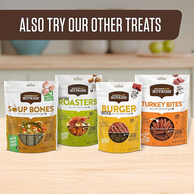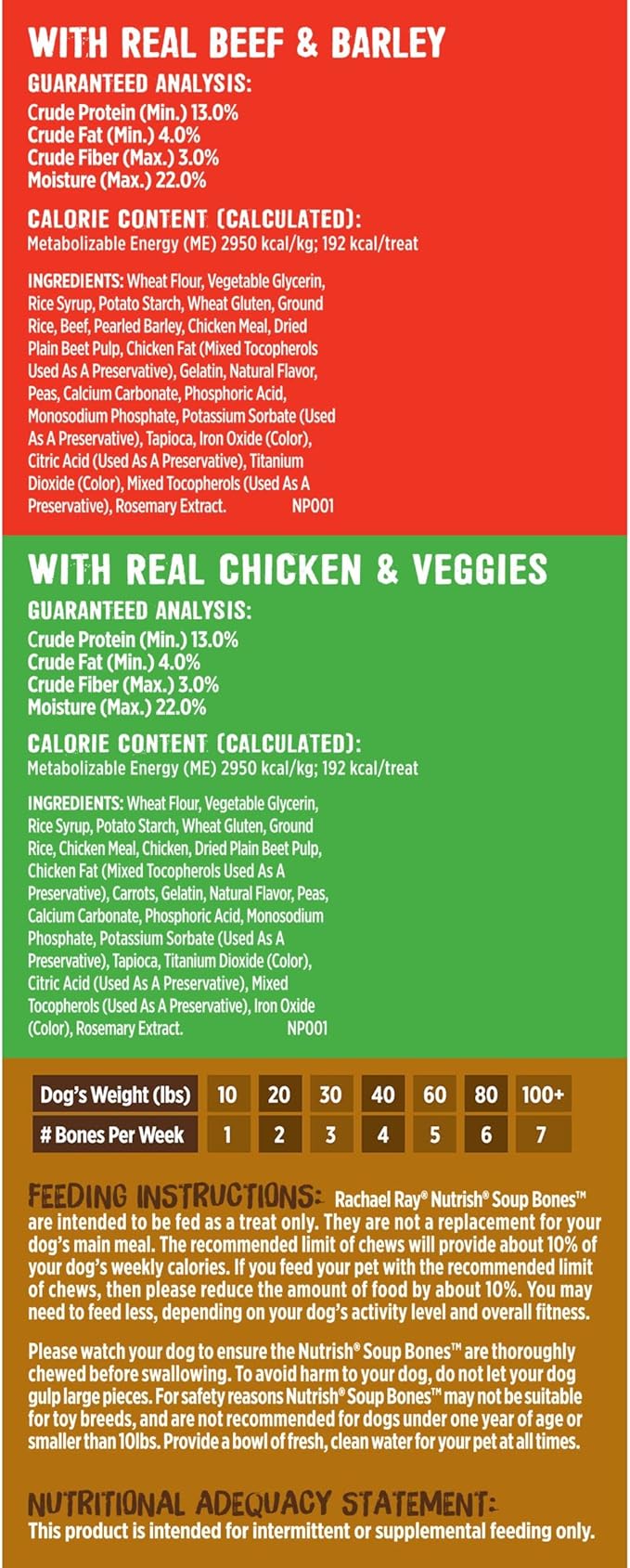 - Contains two (2) 11-count bags of Rachael Ray Nutrish Soup Bones Long Lasting Dog Chews: 1 bag of Real Beef & Barley bones and 1 bag of Real Chicken & Veggies bones