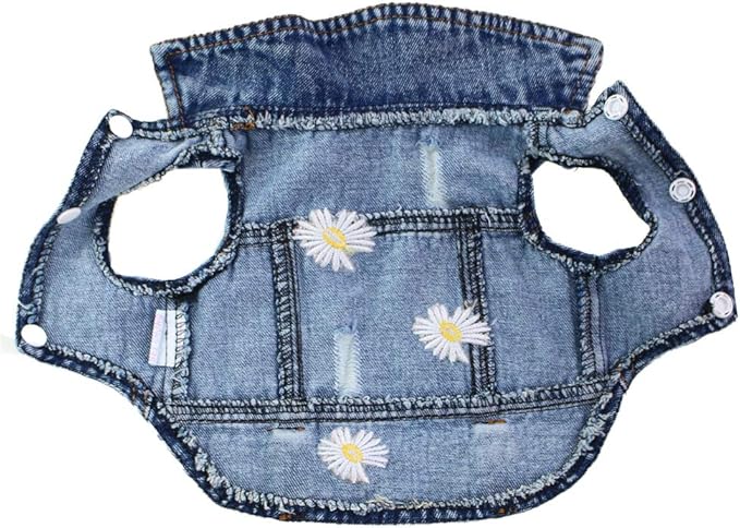 - Fashion Style:Use Soft Material,With Fashion Daisy decor,Retro Jeans Jacket style, lapel collar, Button closure design,easy to put on and take off.Fashion,will be the best gift for your dog.