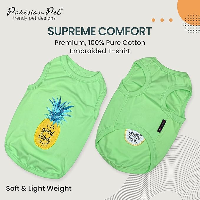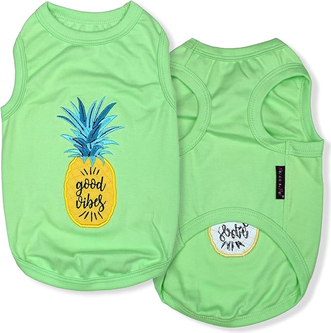 - [ EMBROIDED SHIRTS FOR DOG ] - This stylish dog t-shirt features the embroidered phrase "Good Vibes" alongside a charming embroidered pineapple. this cotton pineapple shirt ensures a comfortable fit for your furry friend, allowing for easy movement and a cozy feel. and the combination of the uplifting message and the playful pineapple design highlights your dog's cheerful personality, spreading good vibes wherever you go.