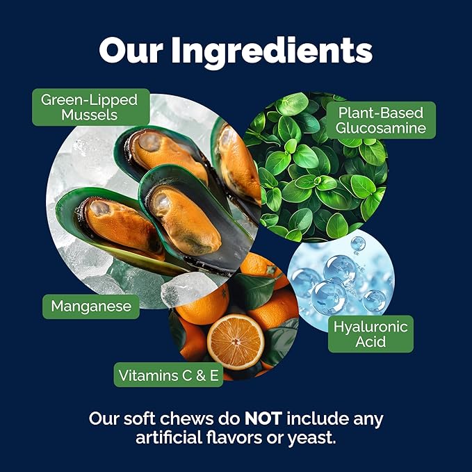 - NATURAL INGREDIENTS SUPPORTING DOG JOINTS : Dog joint chews that support joint structure, healthy cartilage, collagen and dog joint health. Manganese supports dog collagen formation in cartilage, tendons and ligaments, which helps maintain healthy joints. Includes: Glucosamine HCI 750mg, Green Lipped Mussel 450mg, Asorbic Acid Vitamin C 37.5mg, Manganese Sulfate 9mg, Hyaluronic Acid 4.5mg, D-Alpha Tocopherol Vitamin E 1.5mg