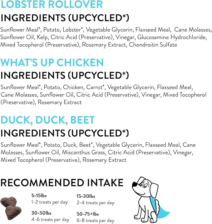 - Upcycled With Care: We work with farmers to rescue their misfit or surplus superfoods that have all the same healthy nutrients. This means every bag of our treats decreases food waste while saving valuable resources.