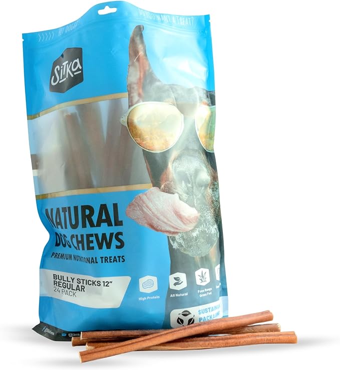Sitka Farms Bully Sticks 12 inch - (24 Count) Bully Sticks Long Lasting Dental Treats for Large Medium and Small Dogs - Fully Digestible Rawhide Free Sticks for Agresive & Medium Chewers