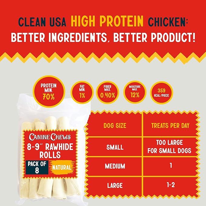 Canine Chews 8-9" Retriever Roll Rawhide Bones for Large Dogs - Durable, Thick Rawhide Bones, Quality Dog Rawhide Chews for Medium to Large Dogs, Thick Size Keeps Dogs Occupied (8 Pack)