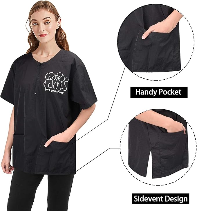 - 🐶【Practical Pockets】-- Double-sided pockets design, convenient to carry small grooming kit when it is necessarily. It is a professional work clothes for pet workers, featuring round neck with a zipper on neck which can slip on and off easily.