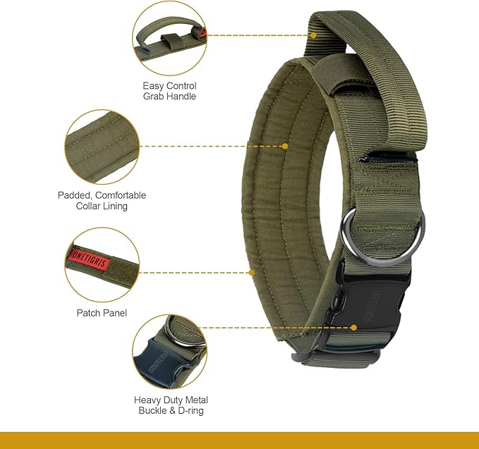 OneTigris Tough Dog Collars, Tactical Dog Collar with Handle, Milltary Adjustable Dog Collar with Heavy Duty Metal Buckle for Training (Medium (Pack of 1), Green)