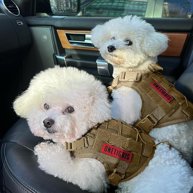- MOLLE System & Military Style: Each side features two MOLLE straps as well as hoop & loop strips panel to easily attach molle pouches or ID panels; OneTigris harness is not designed to bear heavy weights and we advise against relying solely on the grab handle to carry your dog