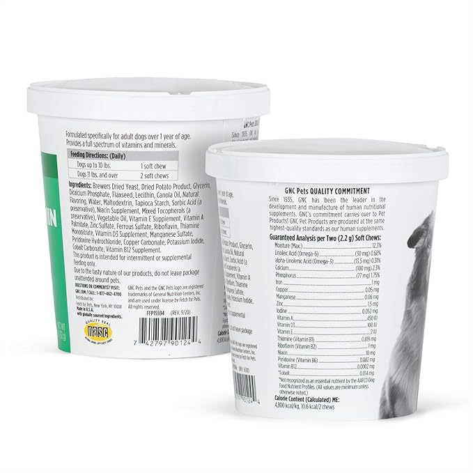 - GNC PETS ESSENTIALS SUPPLEMENTS WITH HEALTHY INGREDIENTS – Multivitamin Soft Chew Supplements for Adult Dogs have healthy ingredients including vitamins and minerals