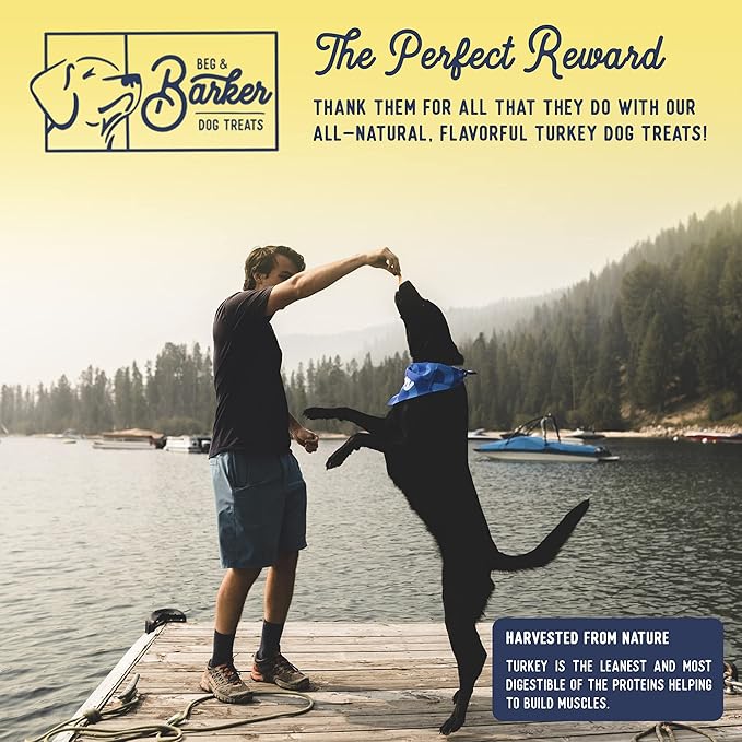 - HUMAN GRADE DOG TREATS TO PROMOTE HAPPY & HEALTHY PETS - Beg and Barker’s low fat dog treats made from whole meat natural turkey jerky can help improve skin and coat condition, improve digestion, energy and brain health, and compliments restricted diets, even for diabetic dogs. Give your best friends the all natural dog jerky they deserve because a healthy dog is a happy dog.