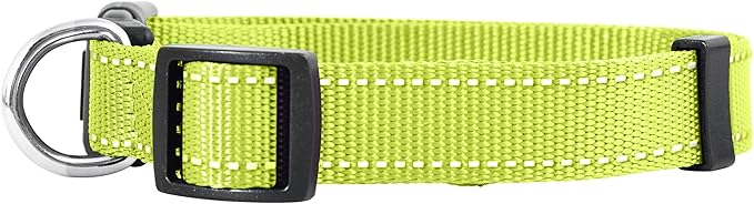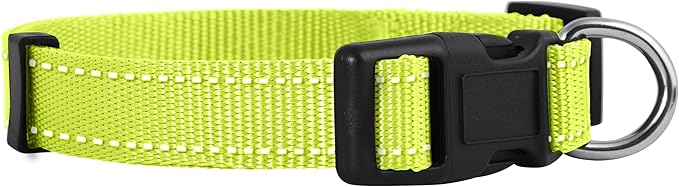 - Reflective Neon Dog Collar: These durable nylon dog collars are made of tough nylon that’s impossible to tear. Strong quick release clips reliably secure the colar around any dog’s neck. Metal D-Rings provide a secure attachment point for your leash.