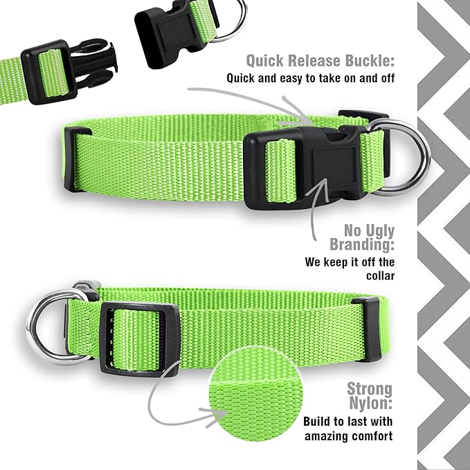 - Neon Dog Collar: These durable nylon dog collars are made of tough nylon that’s impossible to tear. Strong quick release clips reliably secure the colar around any dog’s neck. Metal D-Rings provide a secure attachment point for your leash.