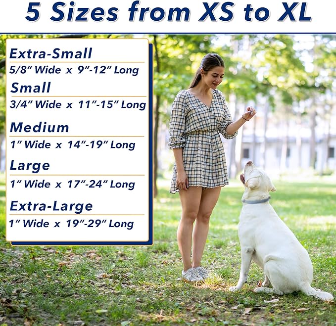- 5 Sizes for X-small to X-large breeds - X-Small (5/8in wide x 9-12in long), Small (3/4in wide x 11-15in long), Medium (1.0in wide x 14-19in long), Large (1.0in wide x 17-24in long), X-Large (1.0in wide x 19-29in long). Great collar and leash set for dogs in the Fuzzy Friends Store below