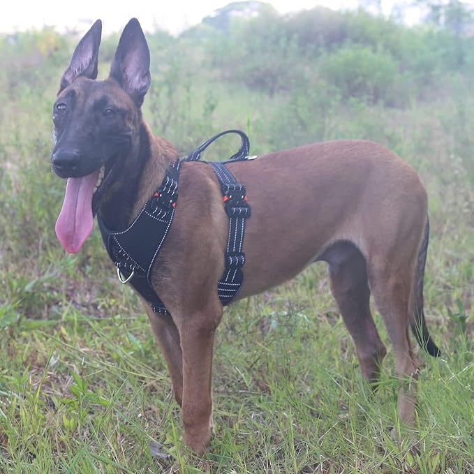 - [Easy on and off ]: 4x Metal buckles on the neck and chect , easy to put on and off the harness , Climbing rated triangle hardware and Integrated metal rotation V-ring on front and back ,Directly connect both triangle hardware with our thicker nylon strap ,make sure the pull force is evenly distributed on metal hardware instead of fabric and stitch