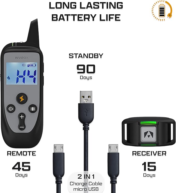 - Extensive Battery Performance : Dog Training Collar with Remote lasting up to 45 days on standby and 15 days per charge. This electric dog collar is backed by award-winning customer support and a 1-year warranty for total reliability.
