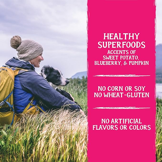 - Made with wholesome foods like sweet potatoes, peas, flaxseed oil, chickpeas, and blueberries.