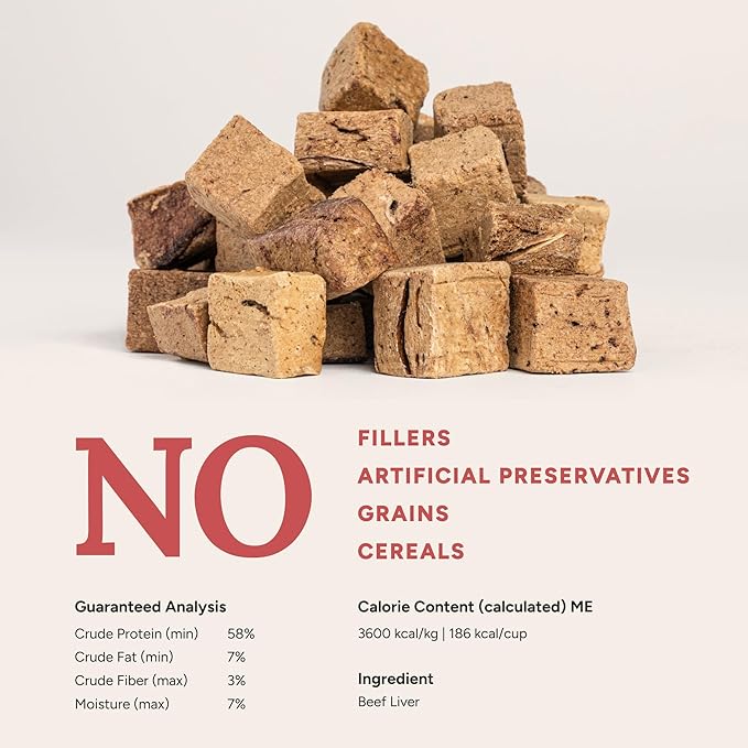 - 1 Single Ingredient: Carefully sourced Beef livers, freeze dried to lock in nutrients. No additives, preservatives, or fillers in these tasty bites.