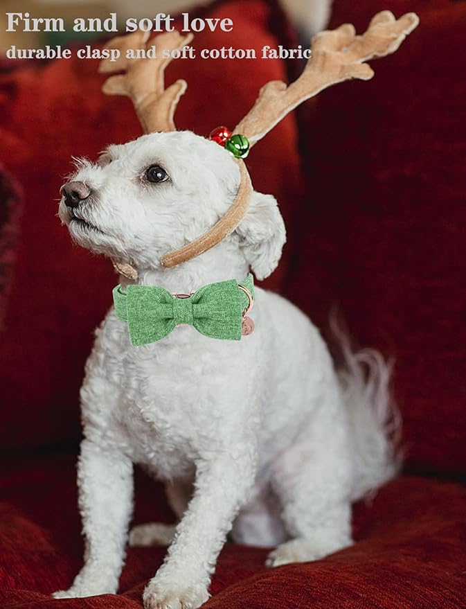 DOGWONG Hemp Cotton Dog Collar with Bow Green Pet Collar Durable Adjustable Puppy Collar for Small Medium Large Dogs
