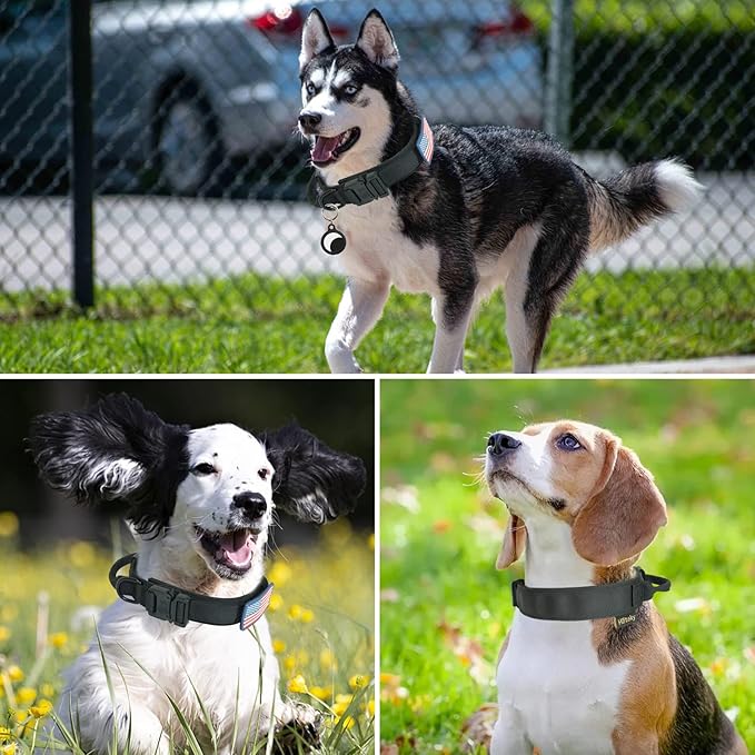 Hotsky Tactical Dog Collar, Adjustable Military Training Nylon Airtag Collar with Handle and Heavy Duty Metal Buckle for Medium Large Dogs, with Airtag Holder and Two Patches(Black,L)