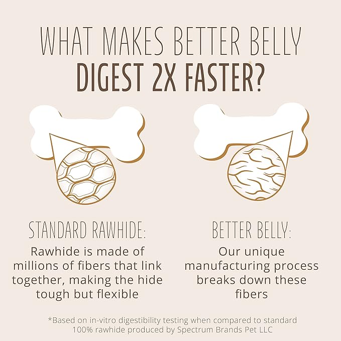 - *Based on in-vitro digestibility testing when compared to standard 100% rawhide distributed by Spectrum Brands Pet LLC.