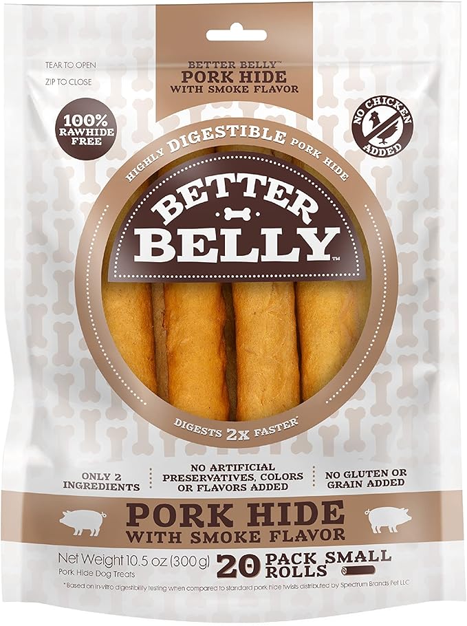 Better Belly Pork Hide Rolls with Smoke Flavor Small, 20 Count, Digestible Pork Hide for Dogs (P-94453)
