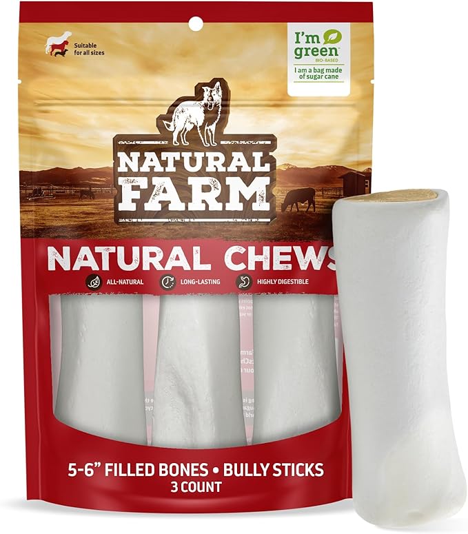 Natural Farm Filled Dog Bones, Bully Stick Flavor (5-6 Inch, 3 Pack), Limited Ingredient Stuffed Dental Dog Bone Treats for Large Dogs