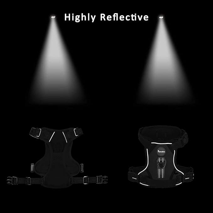 - [ Adjustable, Safe and Comfortable ] The padded areas on the back and chest are very comfortable. It is mesh-lined so that can be wear both winter and summer. It features 4 easy adjusting straps, you can use 2 neck straps and 2 chest straps to create a perfect fit for your dog with some room of growth. It fits well enough to not slip around when your dog is walking, trotting or running. With reflective material which makes finding a your pup in the dark very easy even without a flashlight!