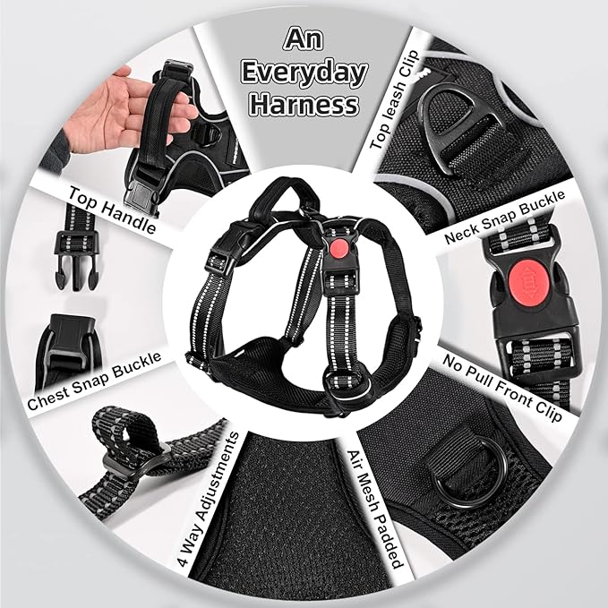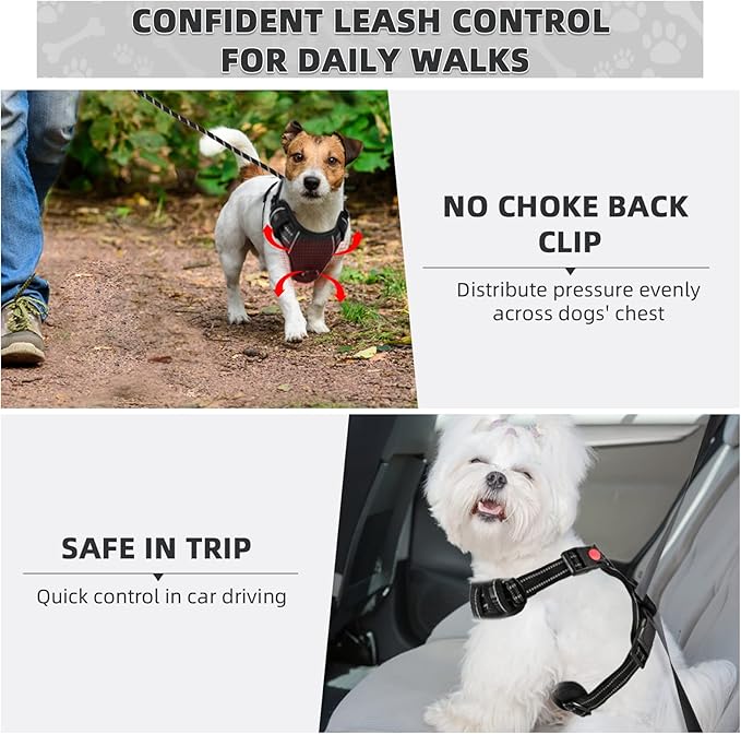 - 【No Pull, No Choke】 - Our non-pulling dog harness is specially designed with 2 metal leash rings for safer dog walks. Use the chest attachment clip to stop your dog from pulling on walks, perfect for dog training or dogs who tend to pull. The back one is great for casual walks, jogging, hiking, etc
